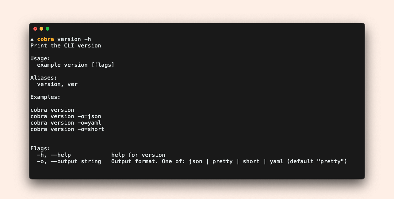 The quick start guide describes how to set up version with the most common way of creating CLIs in Go. It uses Cobra and GoReleaser.